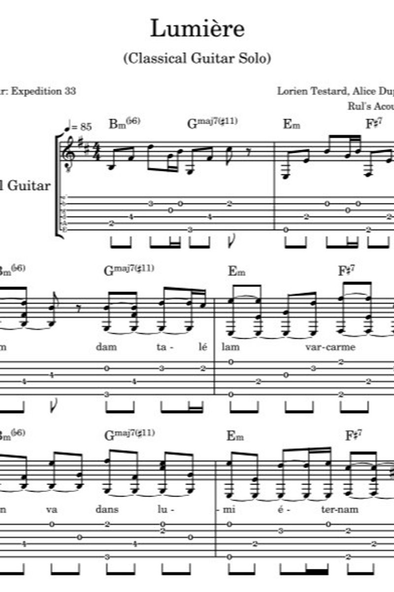 Play the Lumière - Clair Obscur Expedition 33 (Classical Guitar Solo) with this simple, easy-to-play, yet professional arrangement. Suitable for both advanced and enthusiastic students, this sheet music is clearly formatted for motivated students who want to challenge themselves with popular music.