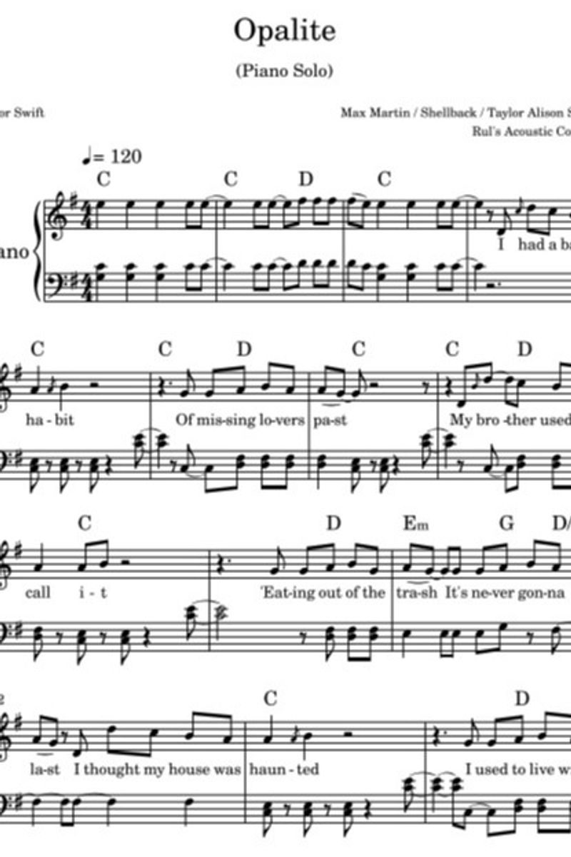 Play the Opalite by Taylor Swift (Piano solo) with this simple, easy-to-play, yet professional arrangement. Suitable for both advanced and enthusiastic students, this sheet music is clearly formatted for motivated students who want to challenge themselves with popular music.